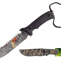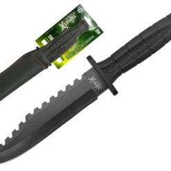 Faca em aço carbono de alta qualidade, acompanha bainha rígida com passador para cinto na cor preta, cabo com ponta rosqueável, que acompanha Bússola + Kit sobrevivência: Anzol, Fosforo, Linha.